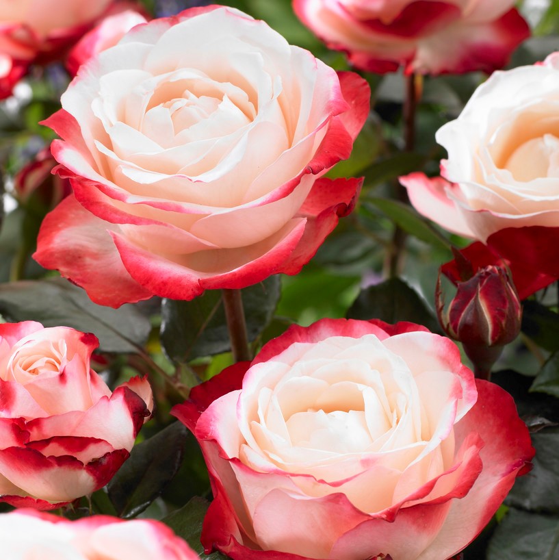 Nostalgie®' är en förtrollande tehybridros som fascinerar med sina stora, fyllda blommor i en slående färgkombination. De cremevita kronbladen kontrasterar vackert mot de djupt körsbärsröda kanterna, vilket ger en dramatisk och elegant effekt. Rosens milda, fruktiga doft förhöjer dess charm ytterligare. Den blommar rikligt från tidig sommar till sen höst och är lika vacker i rabatten som i buketter.
