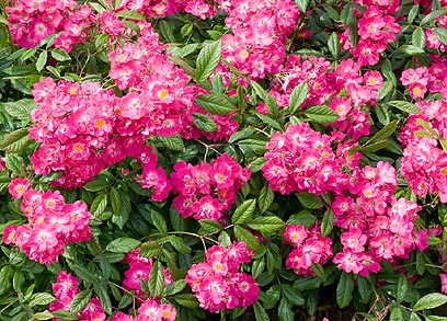 rödrosa m vit mitt, halvfyllda små blo. i klasar, svag doft, små orangeröda nypon, nästan taggfri, 1-1,5m, juni-okt, sol, halvskugga, anno 1927, zon 1-5.