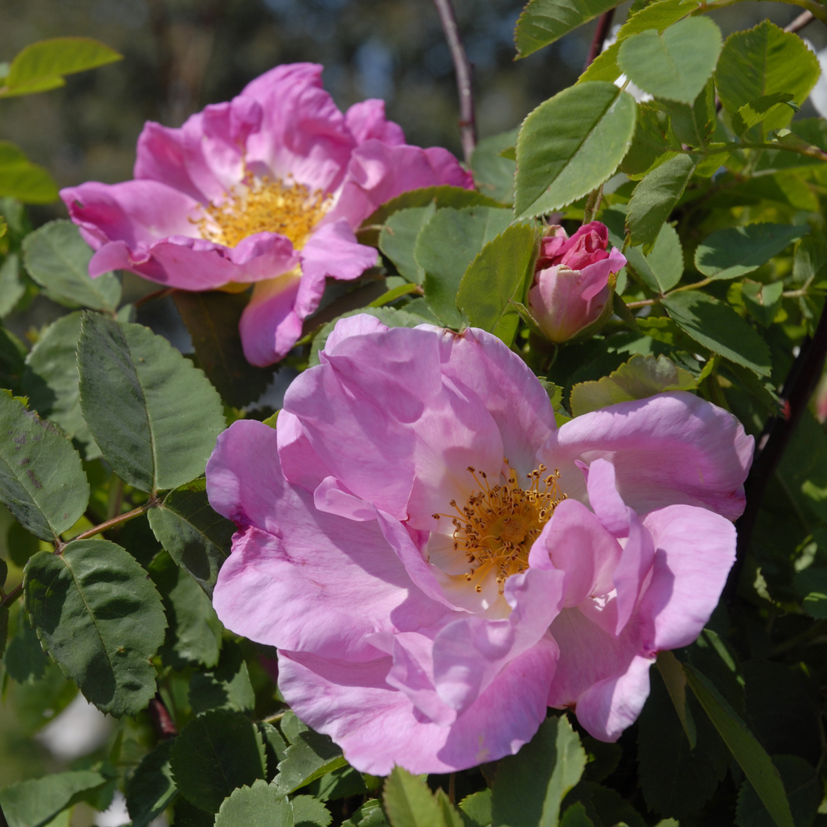 En kraftfull, naturromantisk och nyponrik moyesii-hybrid som ger både storslagna sommarblommor och spektakulära flaskformade nypon långt in på hösten.