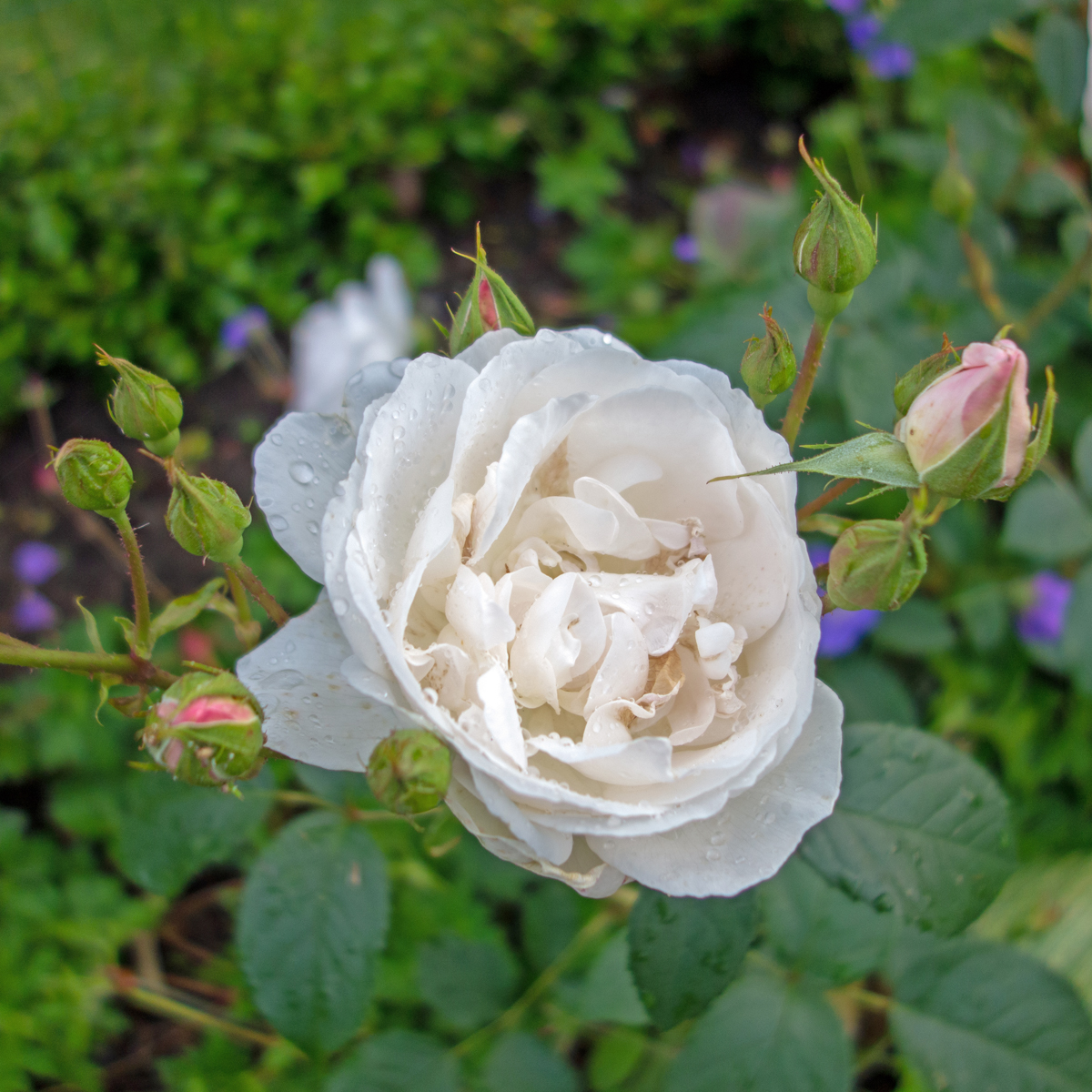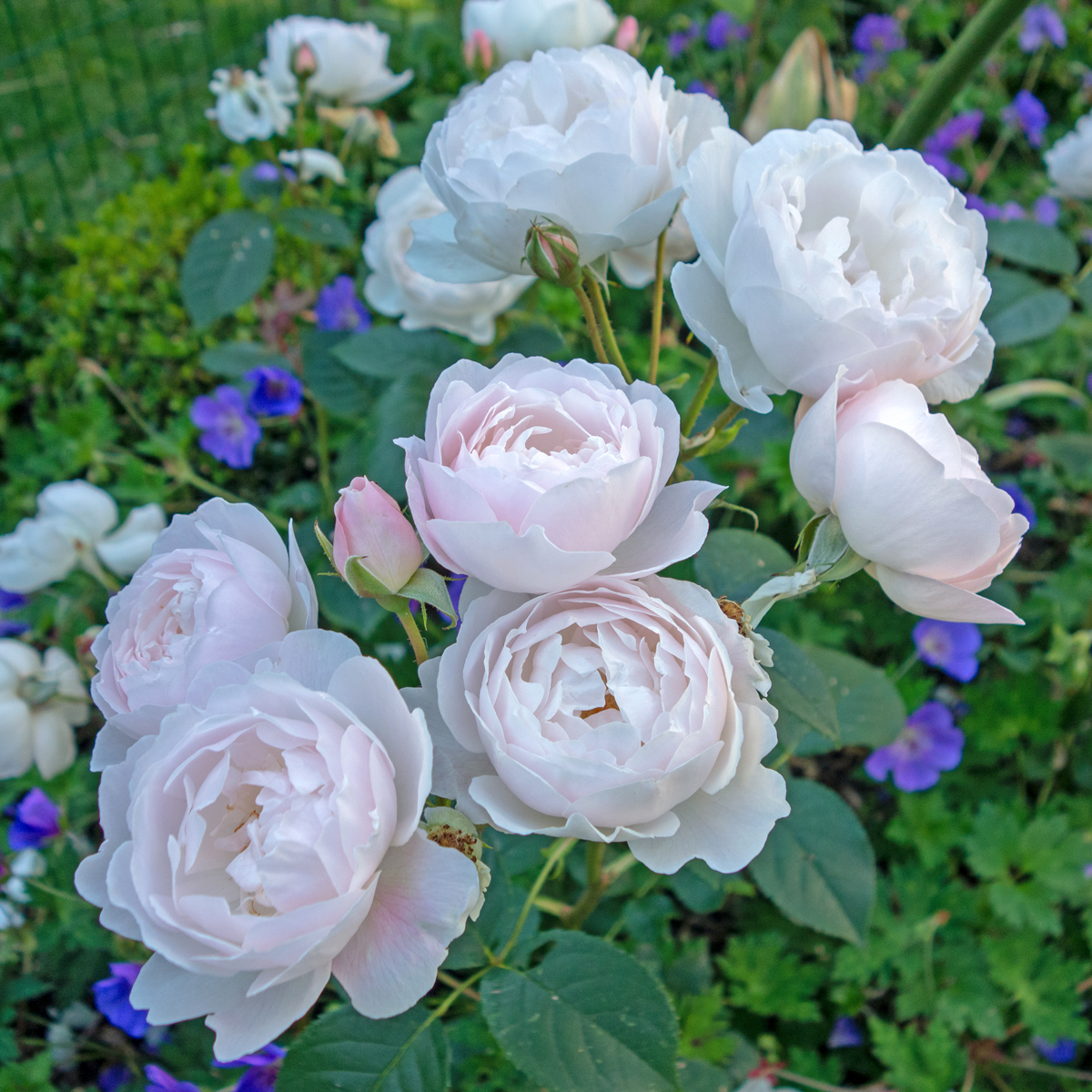 Stora vita blommor med en svag rosa nyans, fyllda och kupade med rosa knoppar.