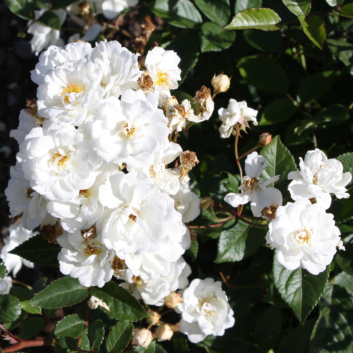 | Först krämvit senare vit, små fyllda blommor i klasar |