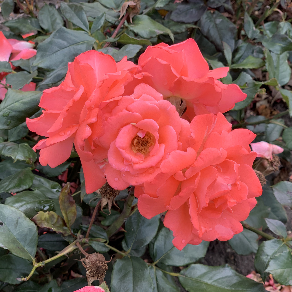 Rosa 'Piccolo' är en floribundaros med små, fyllda blommor i en lysande laxröd nyans. Blommorna har en mild, behaglig doft och blommar rikligt och nästan kontinuerligt från slutet av juni till sen höst. Busken har ett lågt och kompakt växtsätt, blir cirka 40–60 cm hög, och har mörkgrönt, glänsande bladverk där unga skott ofta är purpurfärgade. 'Piccolo' trivs bäst i soliga till halvskuggiga lägen och föredrar mullrik, näringsrik och väldränerad jord. Den är relativt lättskött och passar utmärkt i rabatter, som kantväxt eller i krukor på balkong och terrass. Regelbunden beskärning på våren rekommenderas för att främja ny tillväxt och riklig blomning. Denna sort introducerades 1984 av den tyska rosförädlaren Rosen Tantau och har sedan dess blivit uppskattad för sin lysande färg, kompakta växtsätt och pålitliga blomning, vilket gör den till ett populärt val bland trädgårdsentusiaster.