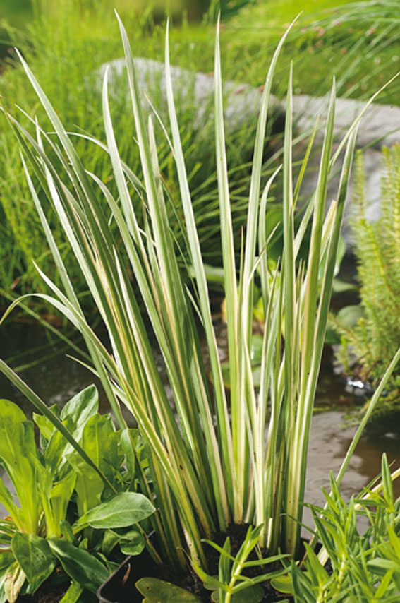 grönvit brokig, doftar citrus, maj-juni, 60cm, vattendjup 0-40cm, sol, halvsk.