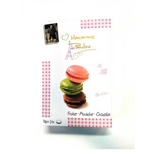 6 macarons jordgubb, pistage och choklad. Krispiga mandelmarängkakor med marsipanfyllning i läckra färger.