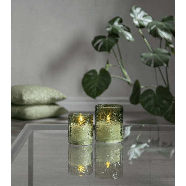 Flamme Leaf är gjord av grönt glas med lövmönster i relief runt ett vitt vaxljuset. Ljuset är cirka 10 x 12,5cm. Detta elektriska ljus blir en vacker dekoration, både ensam och i grupp ihop med övriga ljus från vår Flamme serie. Den har timerfunktion och när brytaren är på timerläget lyser ljuset i ca 30 dagar med en vacker realistisk låga i varmvitt. Den drivs av 2 AA batterier, dessa ingår ej.