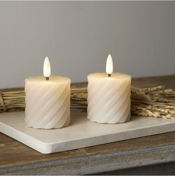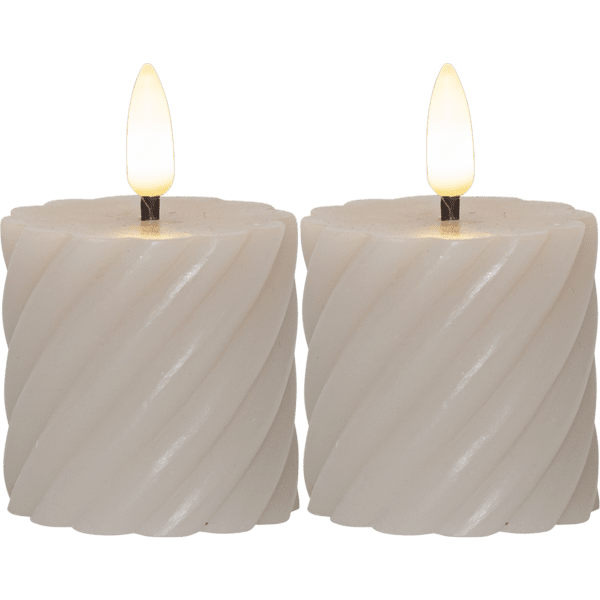 Beige votivljus i 2 pack med twist formad vax i vår Flamme serie. Den naturtrogna lågan lyser med ett varmvitt sken. Med inbyggd timer. Höjd på ljusen med låga ca 7,5cm.