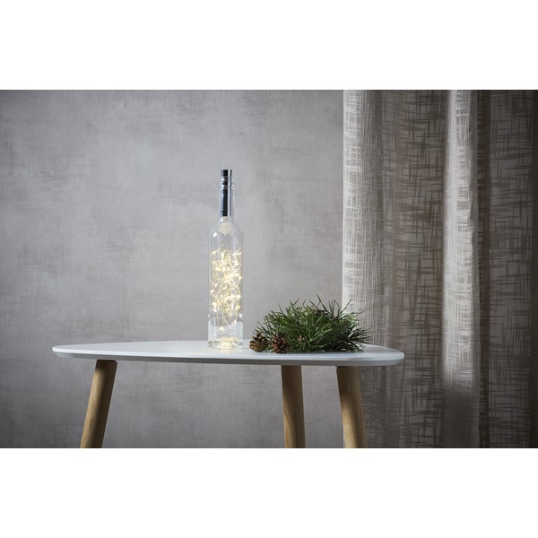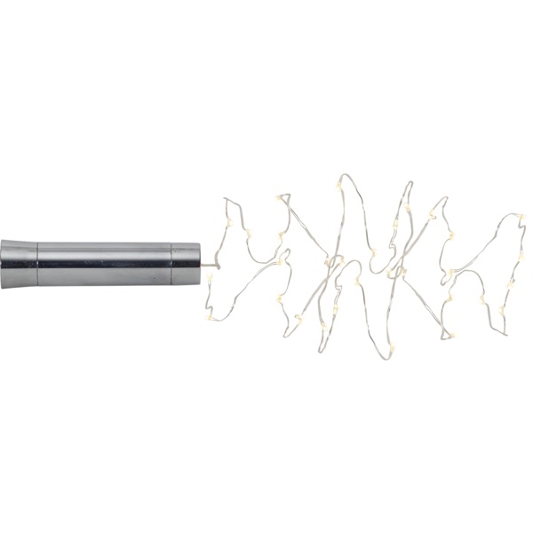 Batterdriven ljusslinga med 40 stycken LED dew drops. Slingan är silverfärgad och ljusen är varmvita. Batteriboxen är formad som en tub för att passa tex i glasflaskor. Mycket användbar slinga för dekoration.