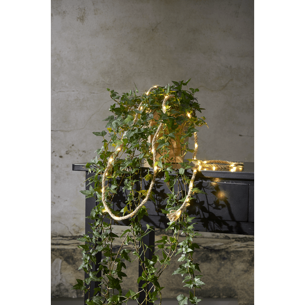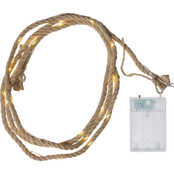 Batteridriven ljusslinga med juterep coh 40 varmvita LED-lampor. Underbar ljusslinga att dekorera med till vardags och fest. Den inbyggda timern gör det lätt att ställa in när ljusslingan ska lysa.