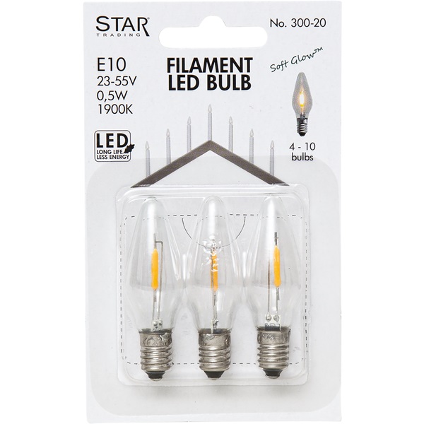 3-pack LED-reservlampor med klart glas och E10 sockel, 23-55V. Denna produkt passar till våra 4-10 armade ljusstakar. För inomhusbruk.