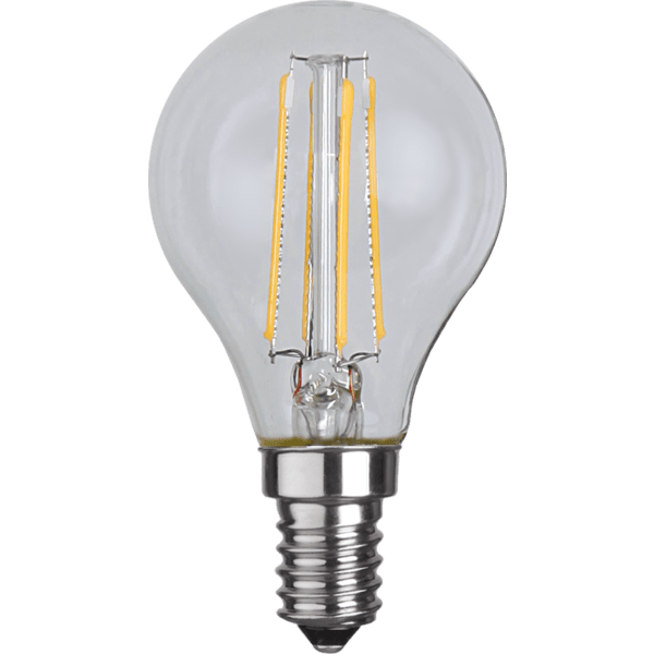 Klotlampa med LED, E14-sockel och klart glas. Färgtemperaturen är 2700K.