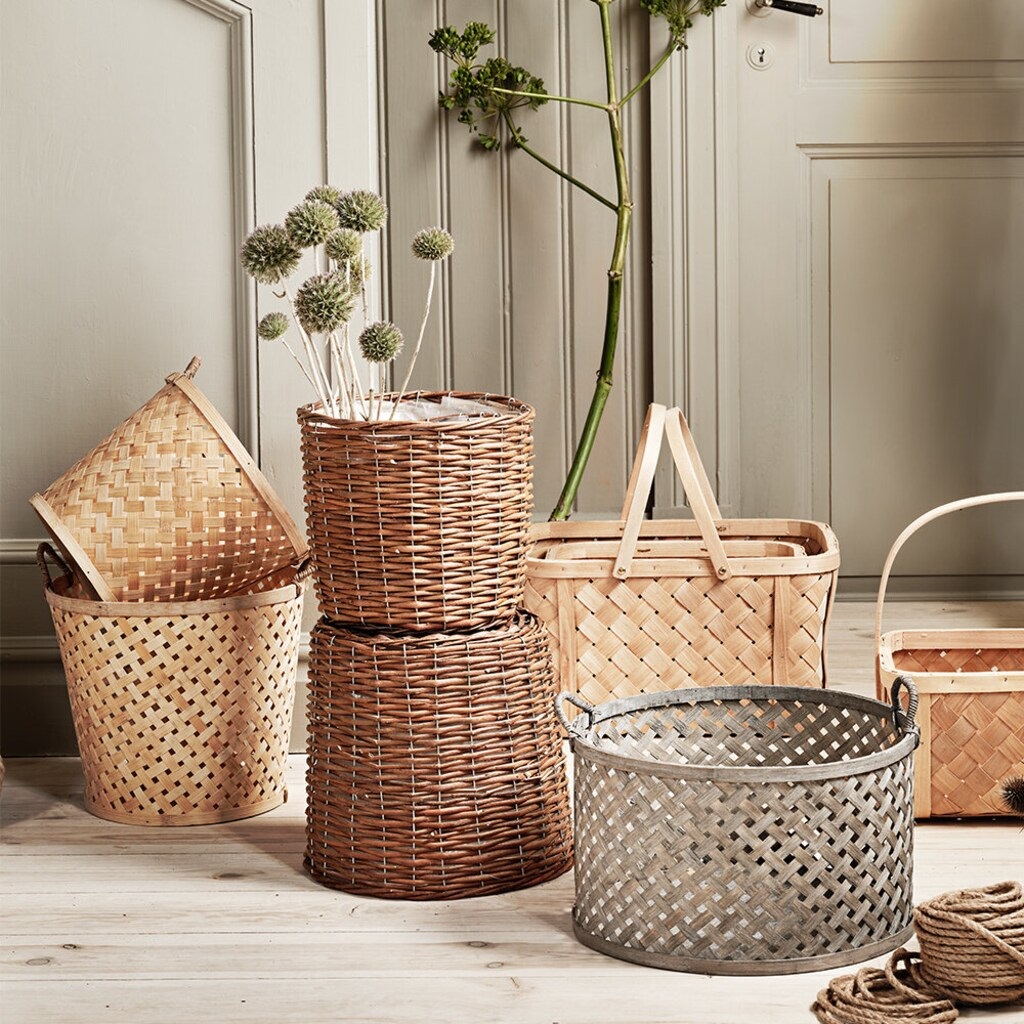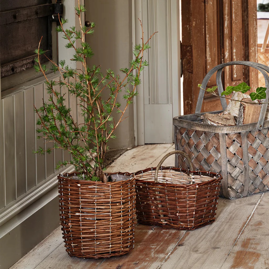 Runda, handflätade pilkorgar i fyra storlekar. Passar till all typ av förvaring, men även som kruka då korgen har en plastad insida som gör att du kan plantera direkt i den. Plasten går att ta bort om du inte vill plantera direkt i korgen och då vill ha den utan plast. Tillverkad av pil från hållbart och långsiktigt skogsbruk som tar hänsyn till växter och djur.