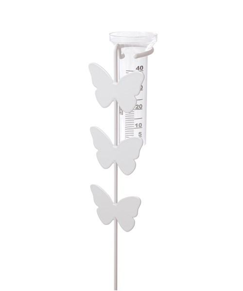 Somrig regnmätare med tre fjärillar och transparant plast glas. Glaset är lätt avläst med en markering mellan 0-40mm Placera regnmätaren så rakt och stadigt om möjligt, gärna på en öppen plats i trädgården. För bästa mätningsresultat brukar man läsa av vid ungefär samma tidpunkt varje dag och och tömas efter mätning.