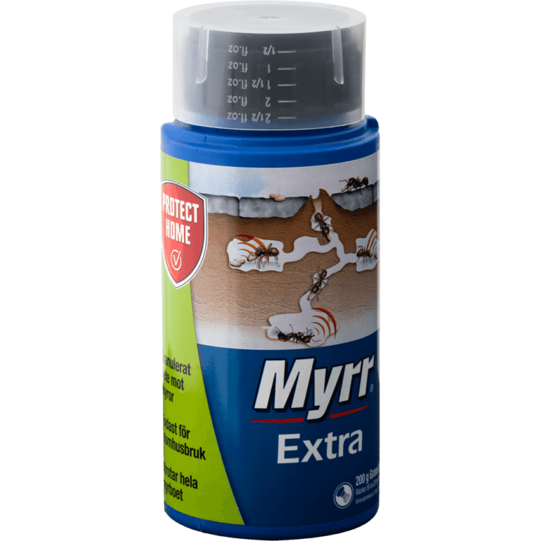 Genom att vara snabb med att strö ut Myrr Extra så fort du ser myror ansamlas skapar du goda förutsättningar för att bli kvitt myrorna innan de tar sig in i huset. Produkten innehåller en blandning av ett sockerbete som drar till sig myrorna samt en biocid som bekämpar myrorna. Det är inte bara myran som kommer i kontakt med myrmedlet som bekämpas, utan genom att bära med sig medlet tillbaka till boet fortsätter bekämpningen även där, vilket innebär du kan utrota hela boet. Myrr Extra är särskilt effektivt mot svartmyror.