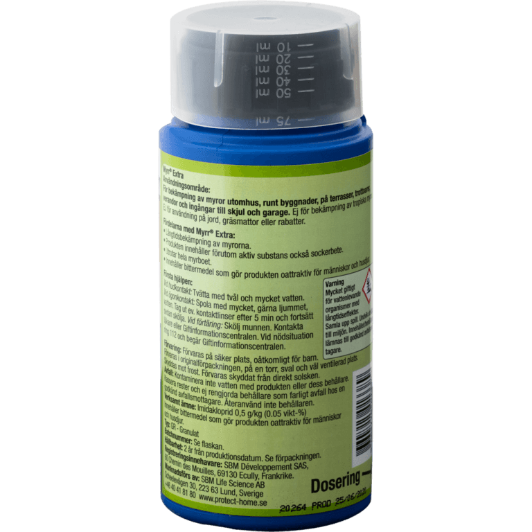 Myrr Extra är ett långtidsbekämpande myrmedel som ökar chanserna för ett helt myrfritt hem. Dess unika granulering gör det enkelt att applicera medlet i sprickor och springor där myrorna ofta syns till. Det får ej användas på jord, gräsmattor eller i rabatter, men med fördel på trädgårdsplattor, betong eller asfalt. Populära platser för myror brukar vara terrasser, trottoarer och verandor, runtomkring bostadshus, förråd eller garage. Strö ut så fort du ser myrorna ansamlas.