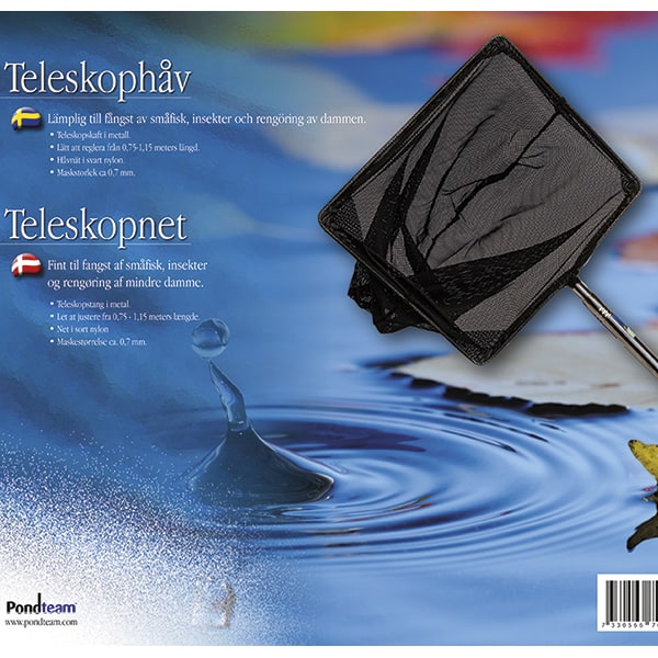 Denna håv i svart finmaskigt nät har teleskopskaft som kan reglera längden på håven, mellan 0,75-1,15 m.