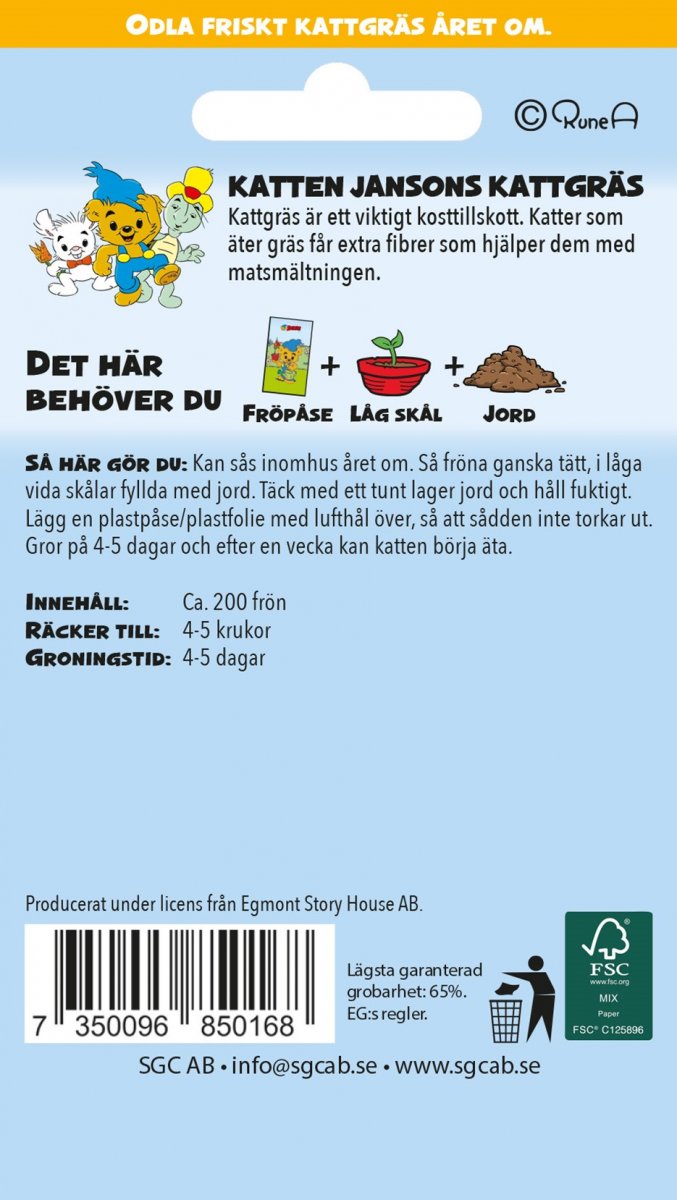Så här gör du: Kan sås inomhus året om. Så fröna ganska tätt, i låga vida skålar fyllda med jord. Täck med ett tunt lager jord och håll fuktigt. Lägg en plastpåse/plastfolie med lufthål över, så att sådden inte torkar ut. Gror på 4-5 dagar och efter en vecka kan katten börja äta.