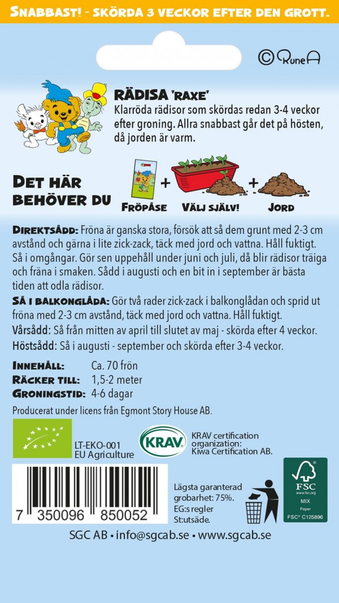 Direktsådd: Fröna är ganska stora, försök att så dem grunt med 2-3 cm avstånd och gärna i lite zick-zack, täck med jord och vattna. Håll fuktigt. Så i omgångar. Gör sen uppehåll under juni och juli, då blir rädisor träiga och fräna i smaken. Sådd i augusti och en bit in i september är bästa tiden att odla rädisor.