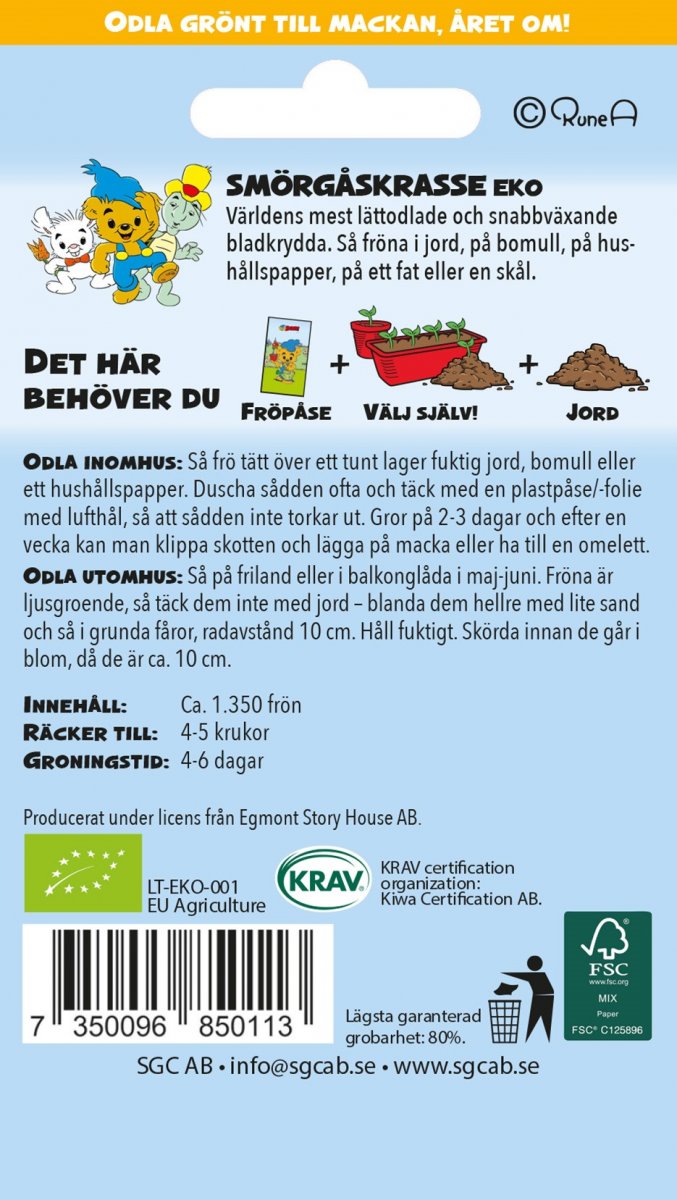 Odla inomhus: Så frö tätt över ett tunt lager fuktig jord, bomull eller ett hushållspapper. Duscha sådden ofta och täck med en plastpåse/-folie med lufthål, så att sådden inte torkar ut. Gror på 2-3 dagar och efter en vecka kan man klippa skotten och lägga på macka eller ha till en omelett.