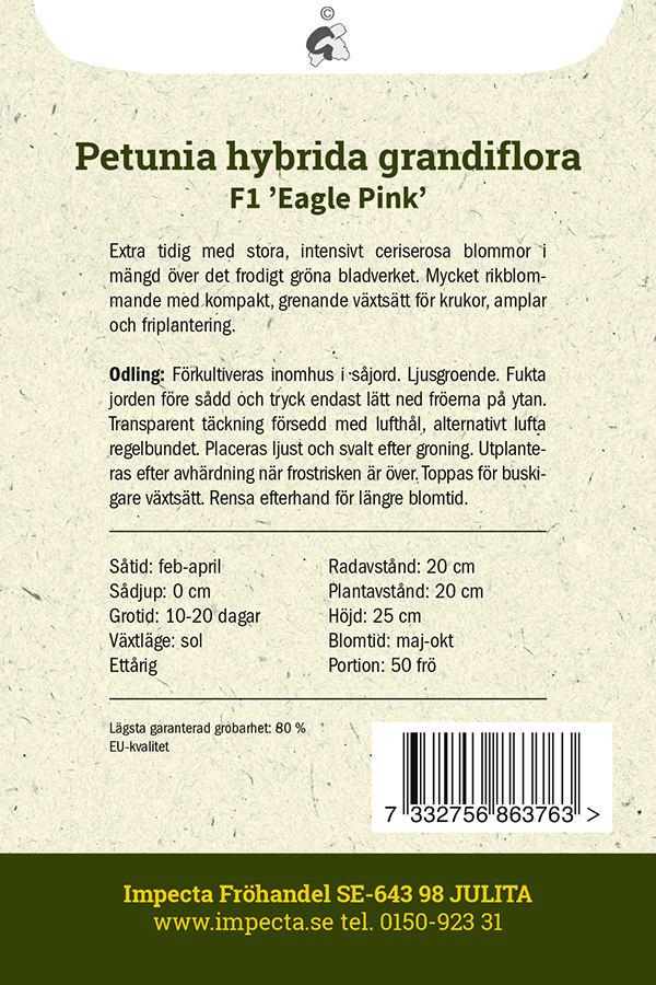 Petunia 'Eagle Pink' (Petunia hybrida grandiflora F1 'Eagle Pink') är en extra tidig sort med strålande ceriserosa blommor och frodig grönska. Den är mycket rikblommande och har ett kompakt, grenande växtsätt som gör den idealisk för krukor, amplar och rabatter. En färgsprakande favorit för sommarens planteringar.