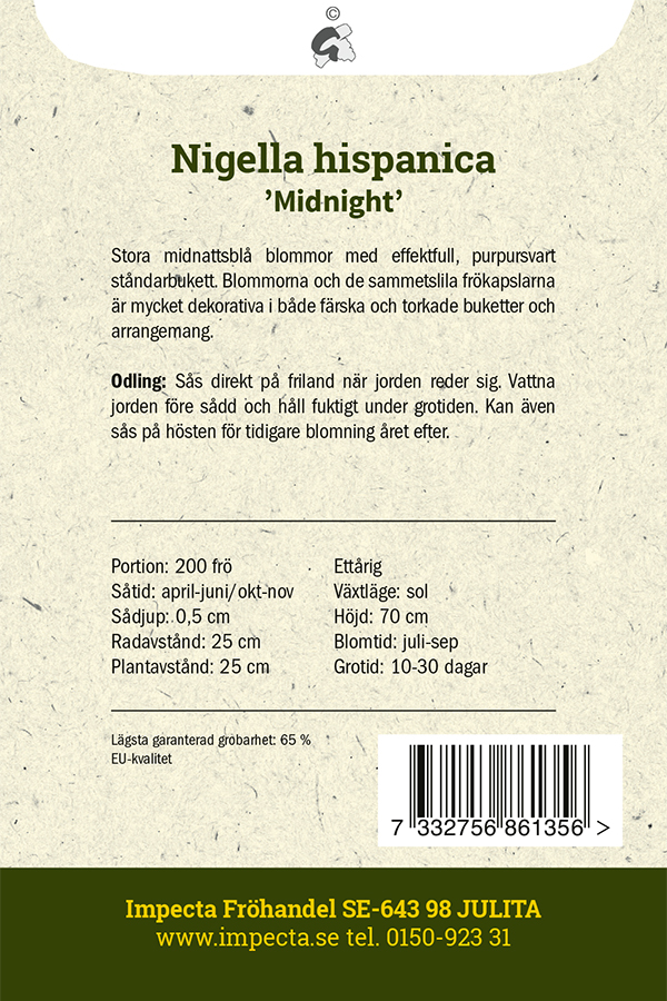 Jungfrun i det gröna 'Midnight' (Nigella hispanica 'Midnight') är en elegant sort med stora, midnattsblå blommor och en slående purpursvart ståndarbukett. Efter blomningen utvecklas sammetslila frökapslar som är lika dekorativa som blommorna, både i färska och torkade arrangemang. Perfekt för rabatter och buketter där den tillför dramatisk skönhet och textur.
