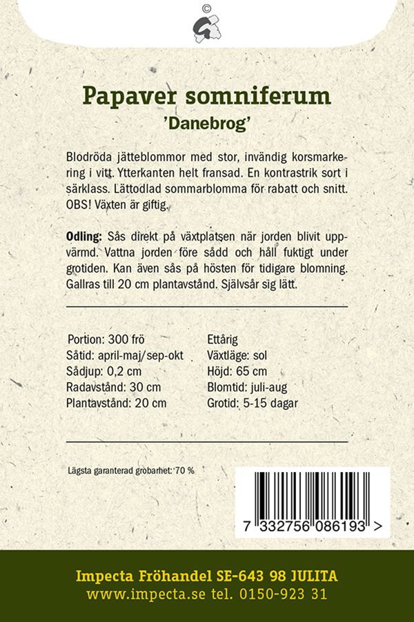 Papaver somniferum Danebrog, Vallmo, Fjäder-, Danebrog