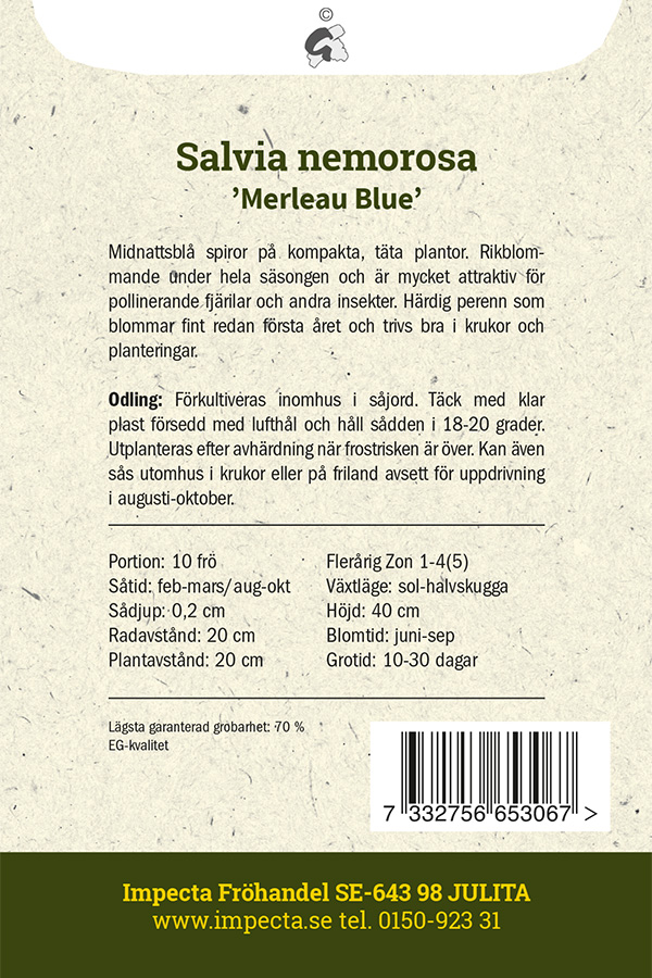 Midnattsblå spiror på kompakta, täta plantor. Rikblommande under hela säsongen. Härdig perenn som blommar första året. Trivs i krukor och planteringar. Bra dragväxt.