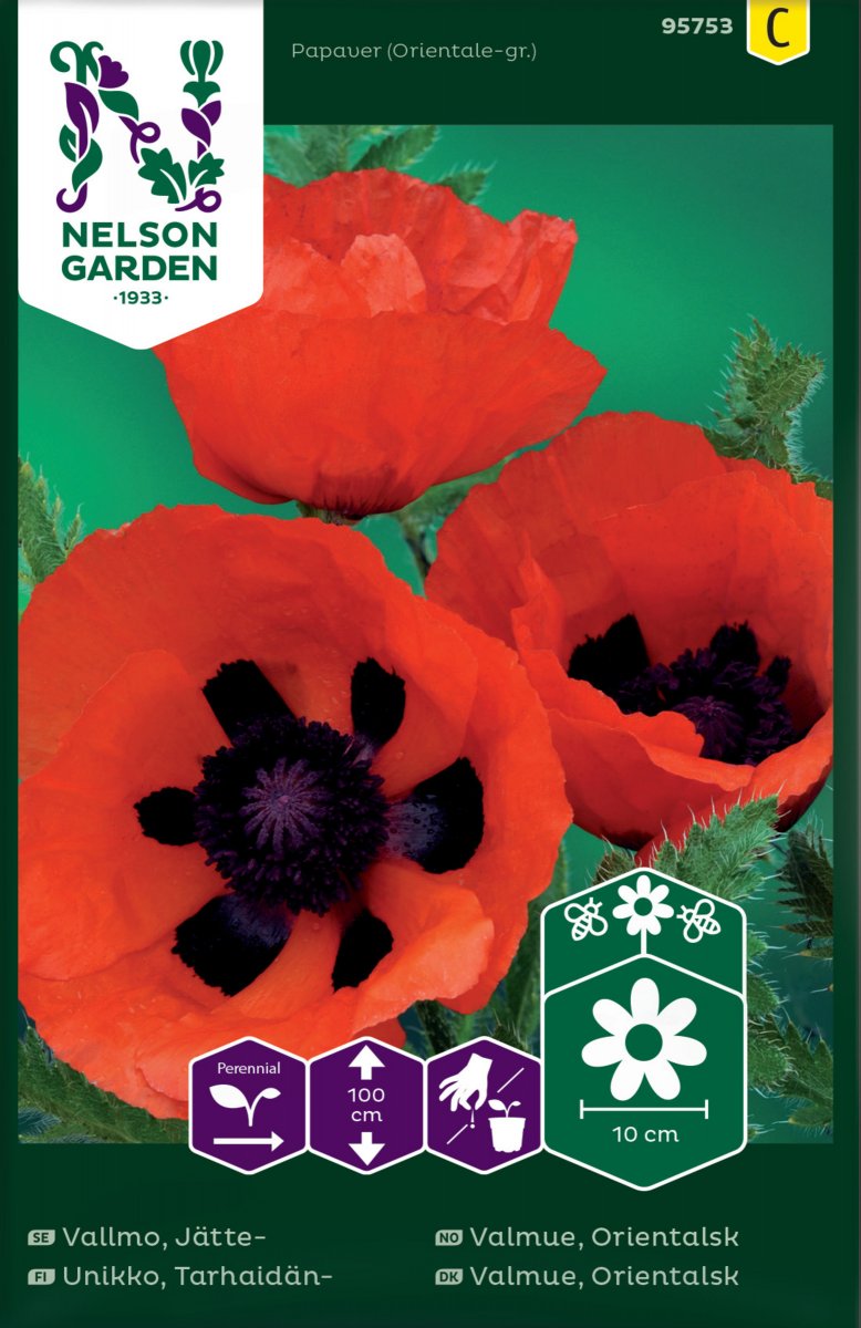 Flerårig, pampig trädgårdsväxt som är mycket dekorativ. Blomstängeln får stora knoppar och starkt orangeröda blommor. De kraftiga, flikiga bladen är tätt behårade och silvergröna till färgen. Skär bort den vissna blomstängeln så kan det komma en extrablomning i augusti. Anspråkslös, tål torka men vattna plantan när den är liten.