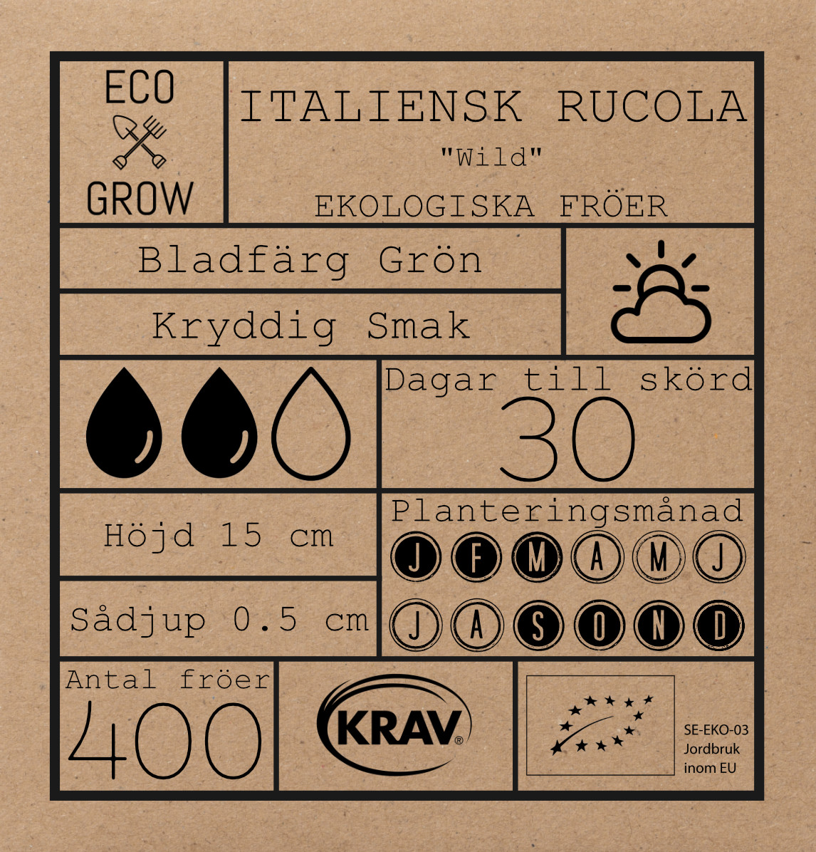 Italiensk Rucola Wild är en lättodlad och snabbväxande sort som växer långsammare, har mildare och mindre blad samt går i blom senare än traditionell rucolasallt. Bildar enskilda blad som skördas efterhand.