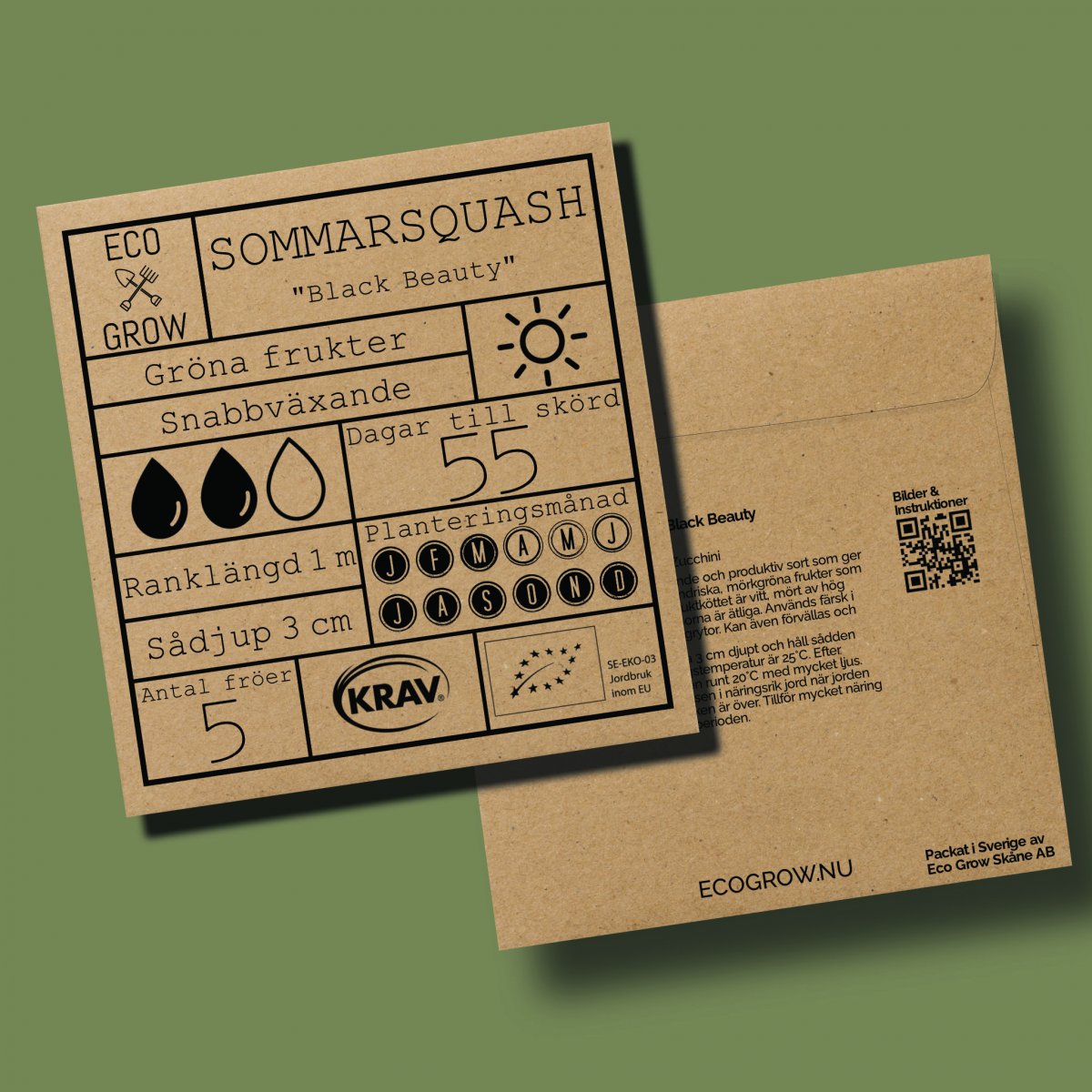 Sommarsquash Black Beauty är en mycket lättodlad och snabbväxande sommarsquash som ger en riklig skörd. Ger cylindriska, mörkgröna frukter som efterhand mörknar med vitt, mört fruktkött av hög kvalité - även blommorna är ätliga. Används färsk i sallder, grillad eller i grytor. Kan även förvällas och frysas in.