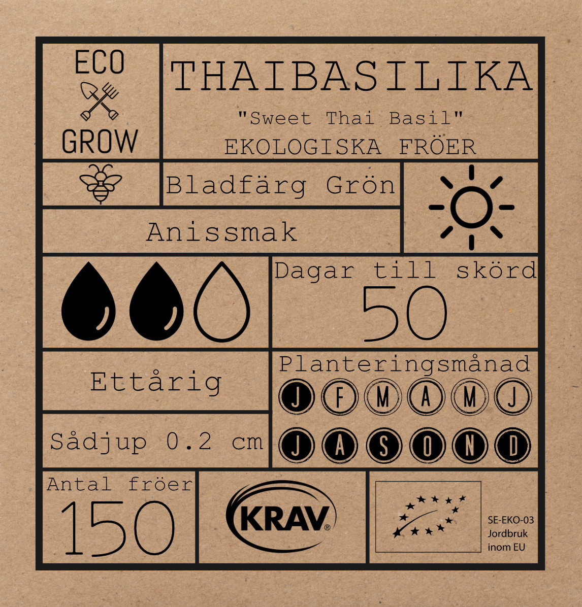 Thaibasilika Sweet Thai Basil - är en orientalisk basilika med en mild och söt smak med en touch av anis. Den har ett robust och mycket dekorativt växtsätt med blanka gröna blad och djupt röda stjälkar. Används främst i det asiatiska köket. De ljuslila blomspirorna är både dekorativa och ätliga och uppskattas av pollinerare.
