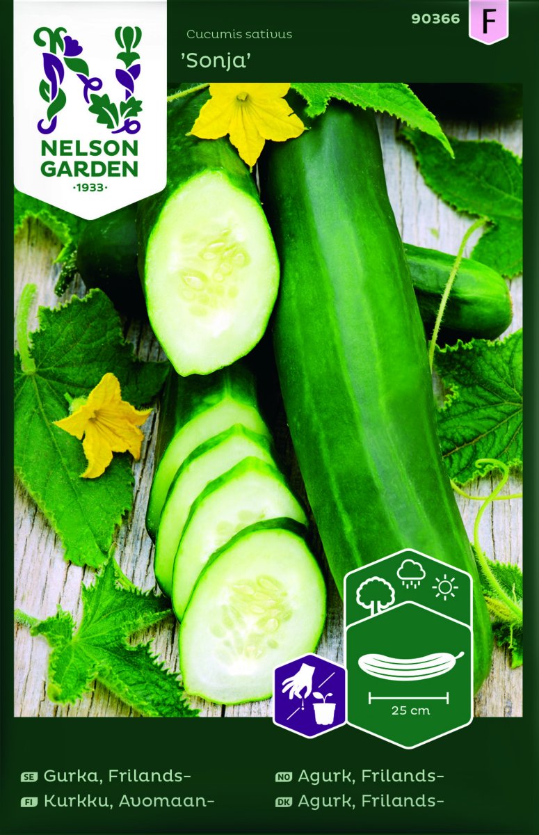 Frilandsgurka ’Sonja’ är en ny och tidig sort från Tyskland som är särskilt framtagen för frilandsodling. Den ger en jämn och riklig skörd av cirka 25 centimeter långa gurkor som är helt släta, med tunt skal och mild, frisk smak. Sorten blir inte bitter, vilket gör den extra pålitlig för både färsk konsumtion och sallader.