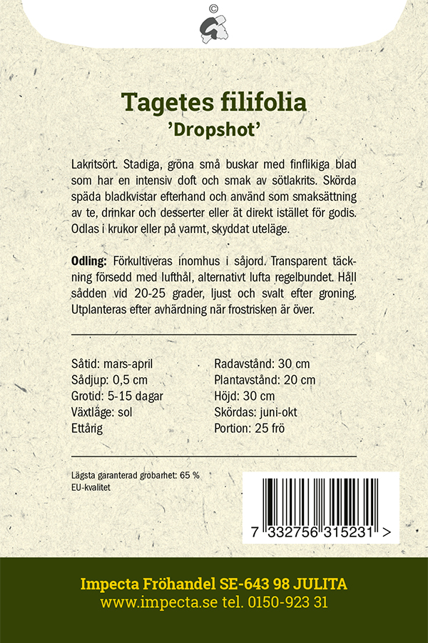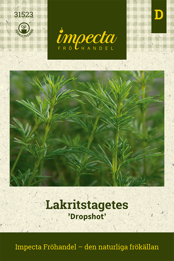 Tuote Kuvaus:Lakritsört. Stadiga små buskar med finflikiga, gröna blad med intensiv doft och smak av sötlakrits. Används som smaksättning. Odlas i krukor eller skyddat, varmt läge utomhus.