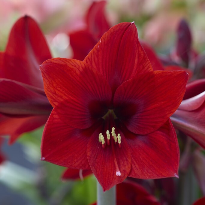 Hippeastrum 'Floris Hekker'® är en kraftfull amaryllis med stora, mörkröda blommor som ger ett imponerande intryck. Den blommar 6–8 veckor efter plantering och når en höjd av 40–50 cm. Med 4–6 blommor per stjälk är den perfekt som julblomma i kruka eller som snittblomma i buketter.