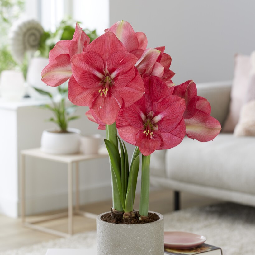 En härligt ceriserosa amaryllis med stora blommor.