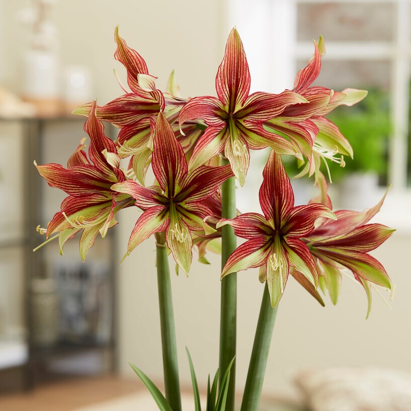 Det här är amaryllisen för dig som som söker något annorlunda än de vanliga klassiska. Denna sort kallas spindelamaryllis och man förstår varför när man ser dess flikiga blommor. Lägre sort som blommar i lime och rött, passar perfekt som dekoration i kruka på bordet!
