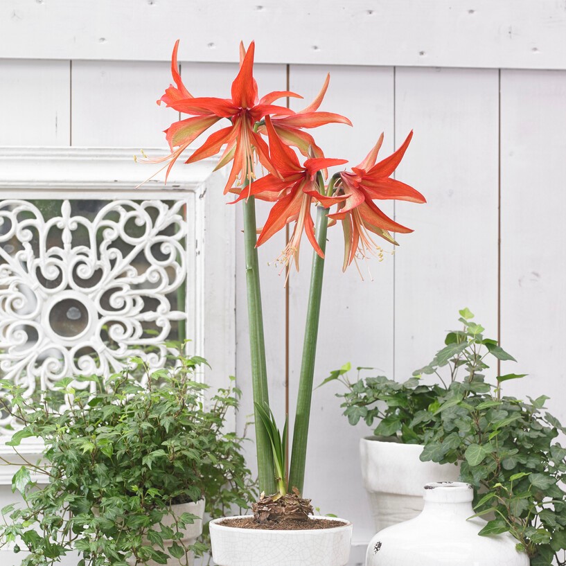 Effektfull med härligt rufsiga röd-orangea kronblad som är ljusare på baksidan.