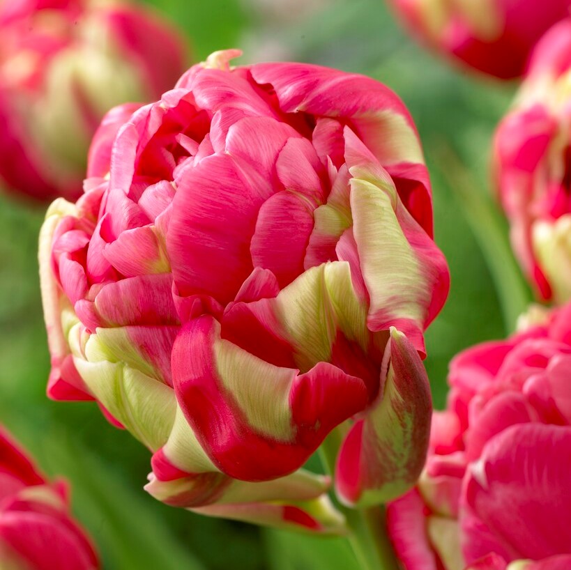 Stor och kraftig tulpan i rosa och de yttre kalkbladen skiftar i grönt.