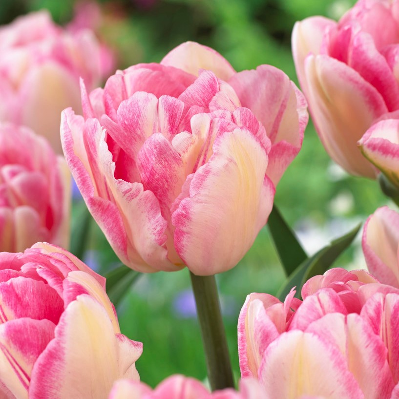 En kompakt, fylld tulpan i dussintals rosa toner. Låt den gärna sväva som i dans bland blåa pärlhyacinter i rabatten. Den pionlika blomman sitter tryggt på stadiga stjälkar, även i regn och rusk, och har en svag doft.