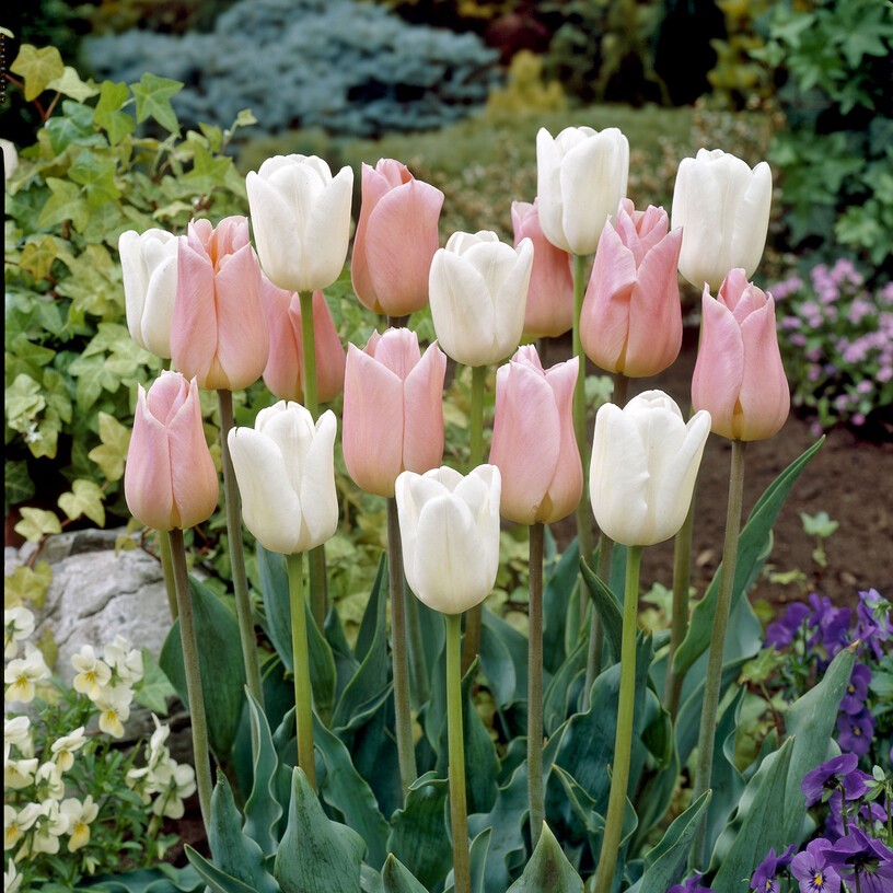 I snövitt och ljuvaste rosa har du en blandning av triumftulpaner här.
