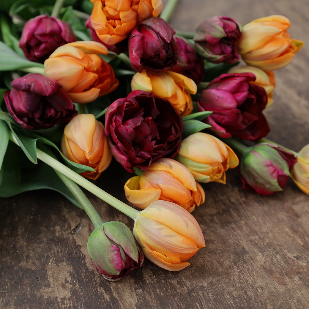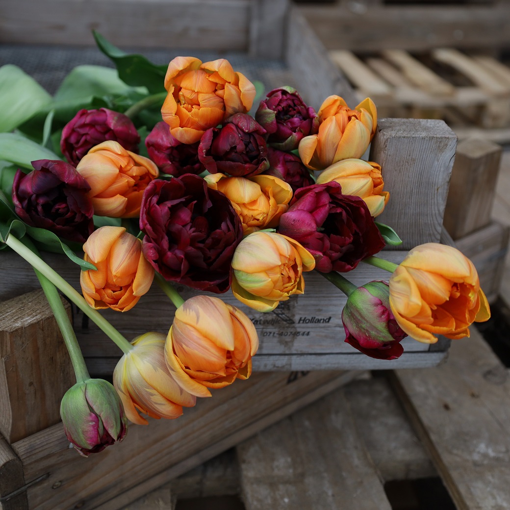 Tulpan Mix Dark FireEn eldig mix av två dubbla sorter. Palmyra som med sina mörka lila toner får hjälp av Orange Princess som lyser upp med sina skiftande orange toner som med sina skarpa och färgstarka toner skapar en kontrast.Den här mixen innehåller:15 tulpanlökar Palmyra. Höjd: 35cm. Blomning: Maj15 tulpanlökar Orange Princess. Höjd: 35cm. Blomning: Maj