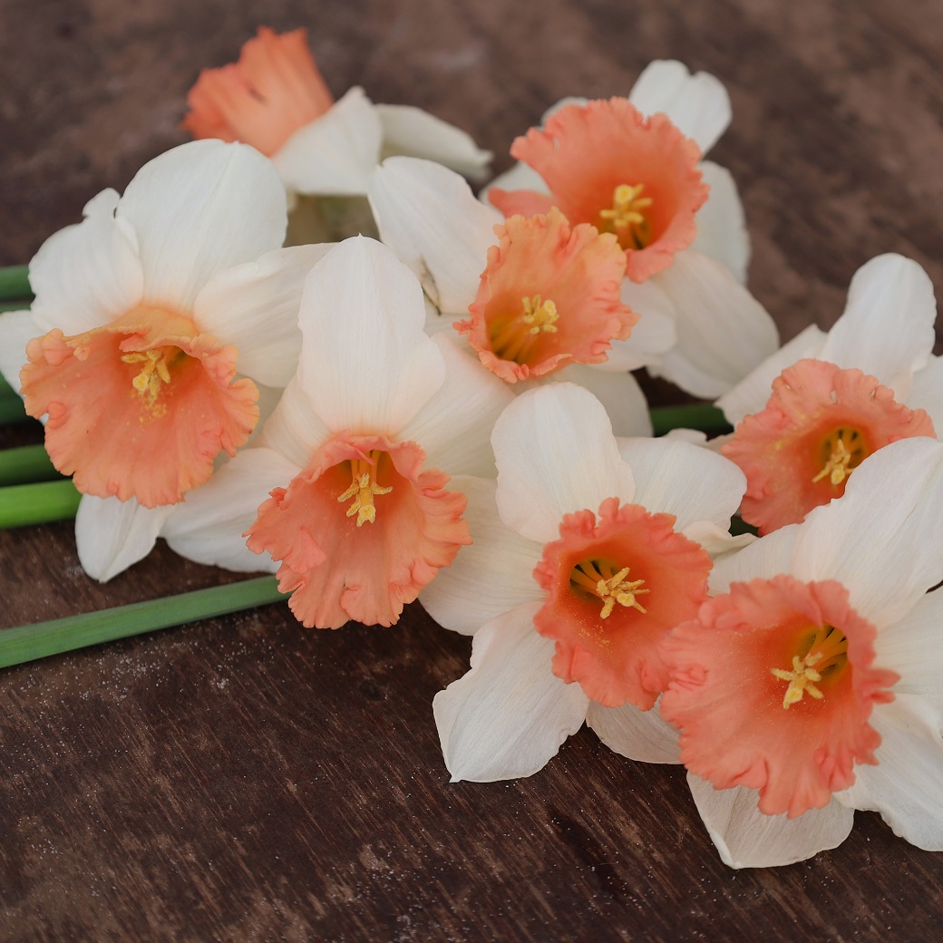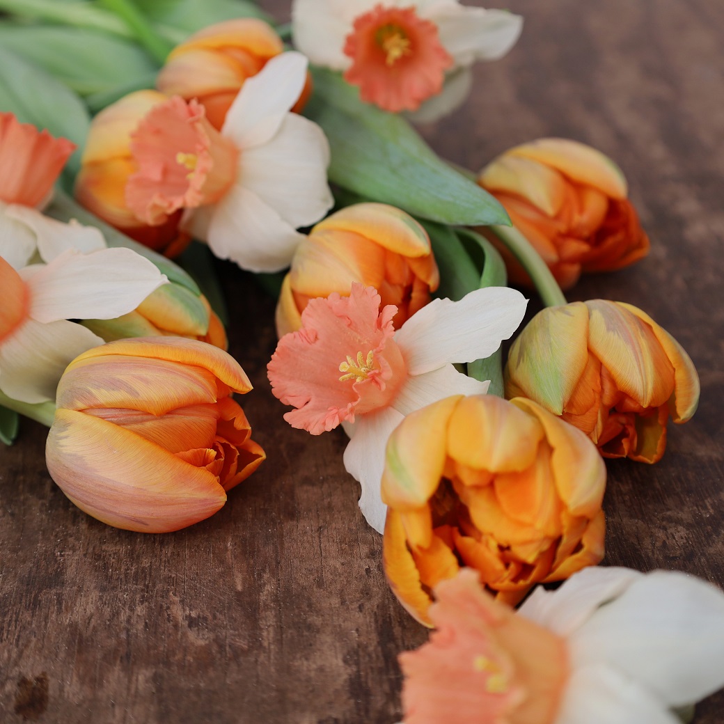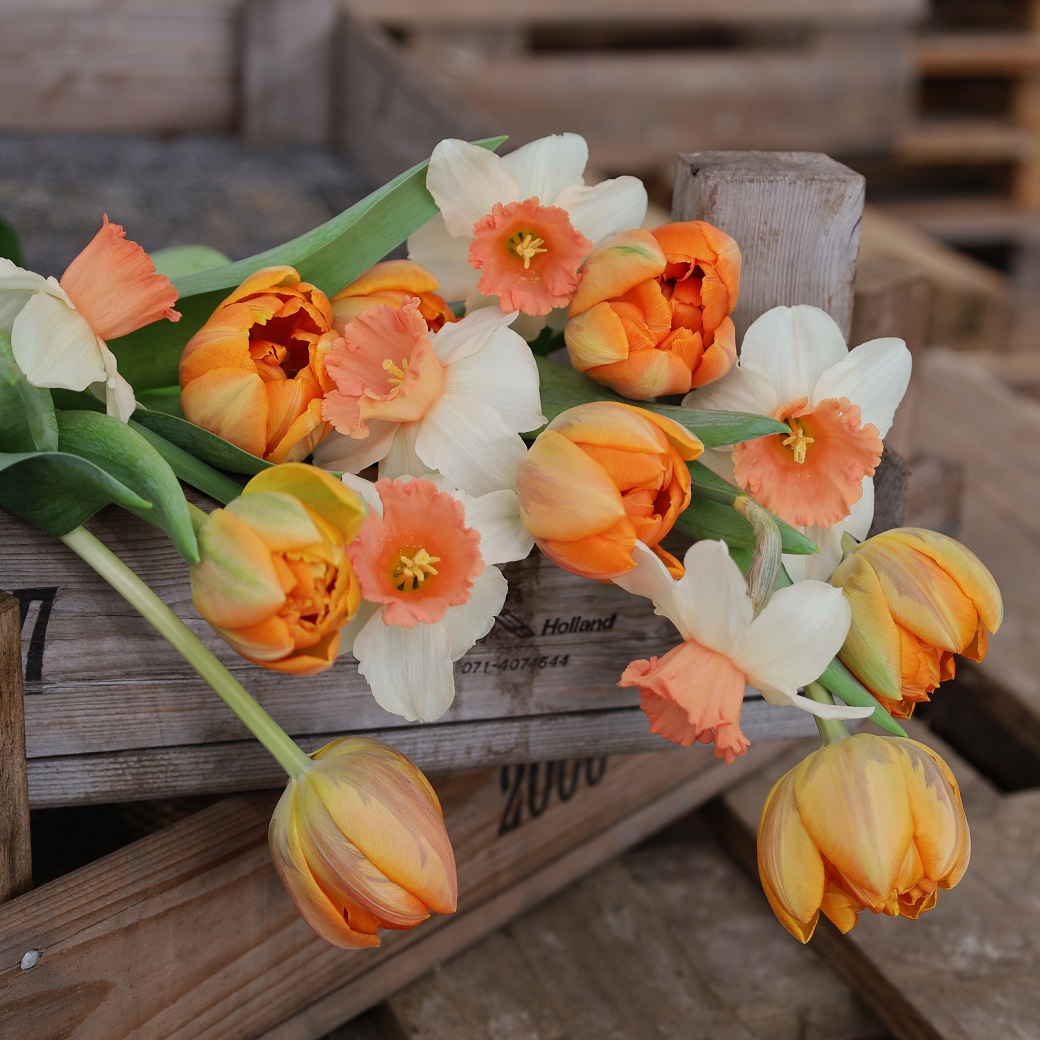 Narcisser och tulpaner går ypperligt att blanda. Likt soluppgången får ni här narcissen Iwona med sina vita blommor och aprikosa toner som lyser upp i mitten likt solen på himlen, förstärkt med den dubbla tulpansorten Orange Princess som verkligen sätter färg på himlen med sina förhållandevis ljusa men starka orange toner.