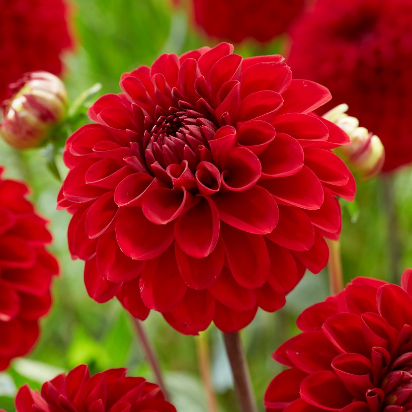 Vacker Pompom-sort med sina klarröda blommor. Sorten lämpar sig även till snitt.