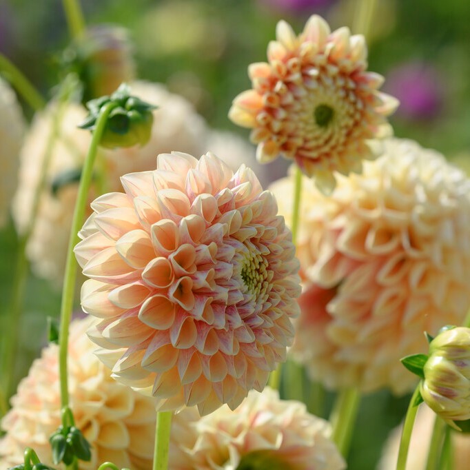 En utmärkt bolldahlia till snitt med aprikos kronblad som har lättare ådring om du går nära.