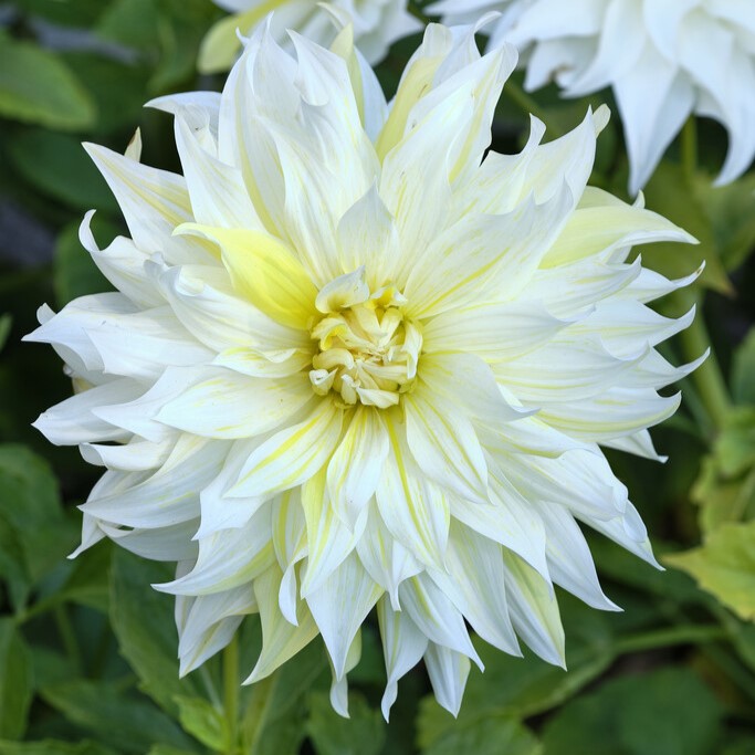 En vacker dahlia med riktigt stora blommor som blir vit med gult stänk.