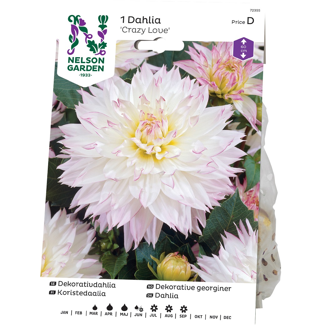 Dekorativdahlia med stora vita blommor med rosa inslag. Med sitt stadiga växtsätt är denna sort ypperlig för kruka eller i samplantering med dina perenner!