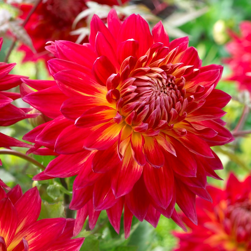Manhattan Island ® får blommor som påminner om en kaktusdahlia men den tillhör den dekorativa gruppen. Blommorna är hallonröda med en gul botten och mitt.
