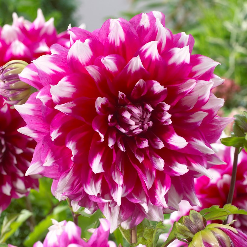 Purpurröda med vita toppar, lätt skruvade kronblad. Denna kan bli en magnifik drottning i din trädgård.