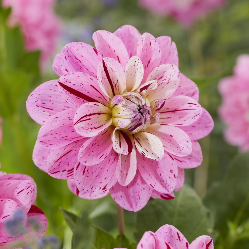 Vilken härlig dahlia! Rosa blommor med röda fläckar och streck.