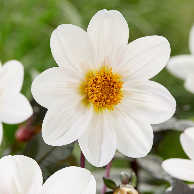 Dahlegria® White (Twynings After Eight) har vita kronblad med svagt strimmiga ådror åt det ros/lila hållet. Ögat är gult och bladverket är mörkt.