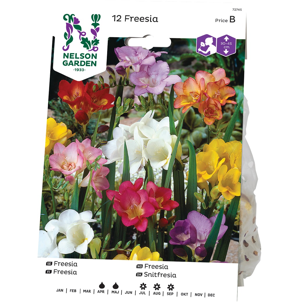 Väldoftande, enkelblommande Freesia i blandade färger. Fin att samplantera med den dubbelblommande i kruka.